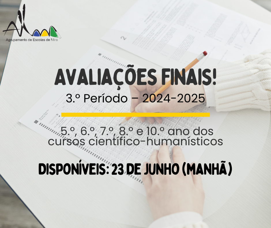 Informam-se os(as) Encarregados(as) de Educação que as avaliações finais do 3.º período dos alunos dos 5.º, 6.º, 7.º, 8.º e 10.º anos de escolaridade estarão disponíveis no próximo dia 23 de junho, durante o período da manhã.