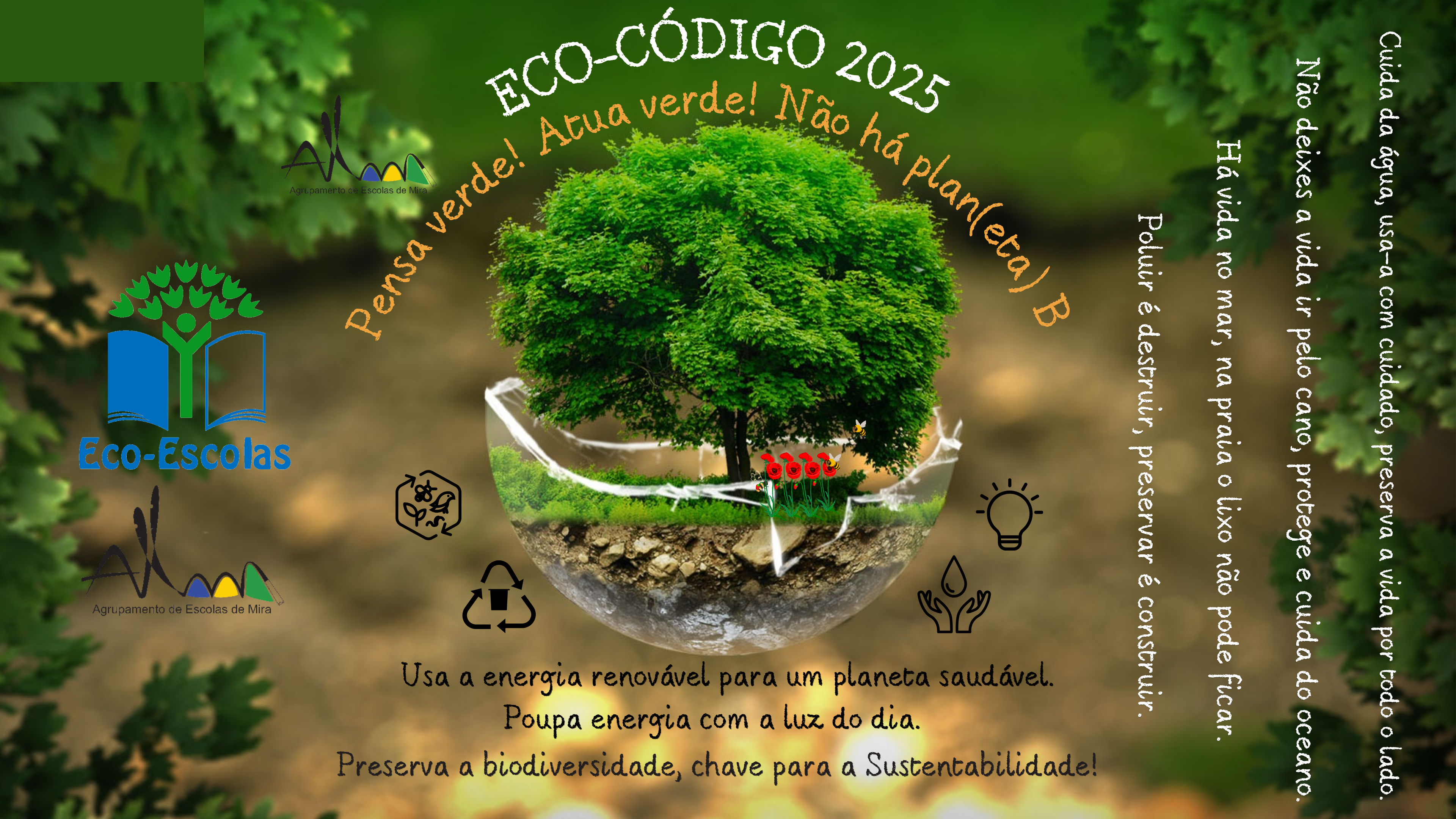 No âmbito do Programa Eco-Escolas, o Agrupamento de Escolas de Mira partilha com toda a comunidade educativa o Eco-Código 2025 – um conjunto de princípios e compromissos que orientam as nossas práticas ambientais e refletem o empenho coletivo por um futuro mais sustentável.