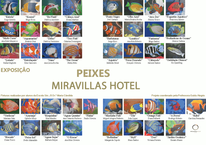 O MiraVillas Hotel em parceria com a Escola Secundaria Drª Maria Cândida apresenta a partir do dia 09 de Março, no Miravillas Hotel uma exposição de trabalhos de acrílico sobre tela, relacionados com a temática “Peixes”. Os trabalhos foram elaborados pelos alunos do 7º, 8º e 9º ano do ano lectivo 2010/ 2011sob orientação da professora Guida Alegrio.