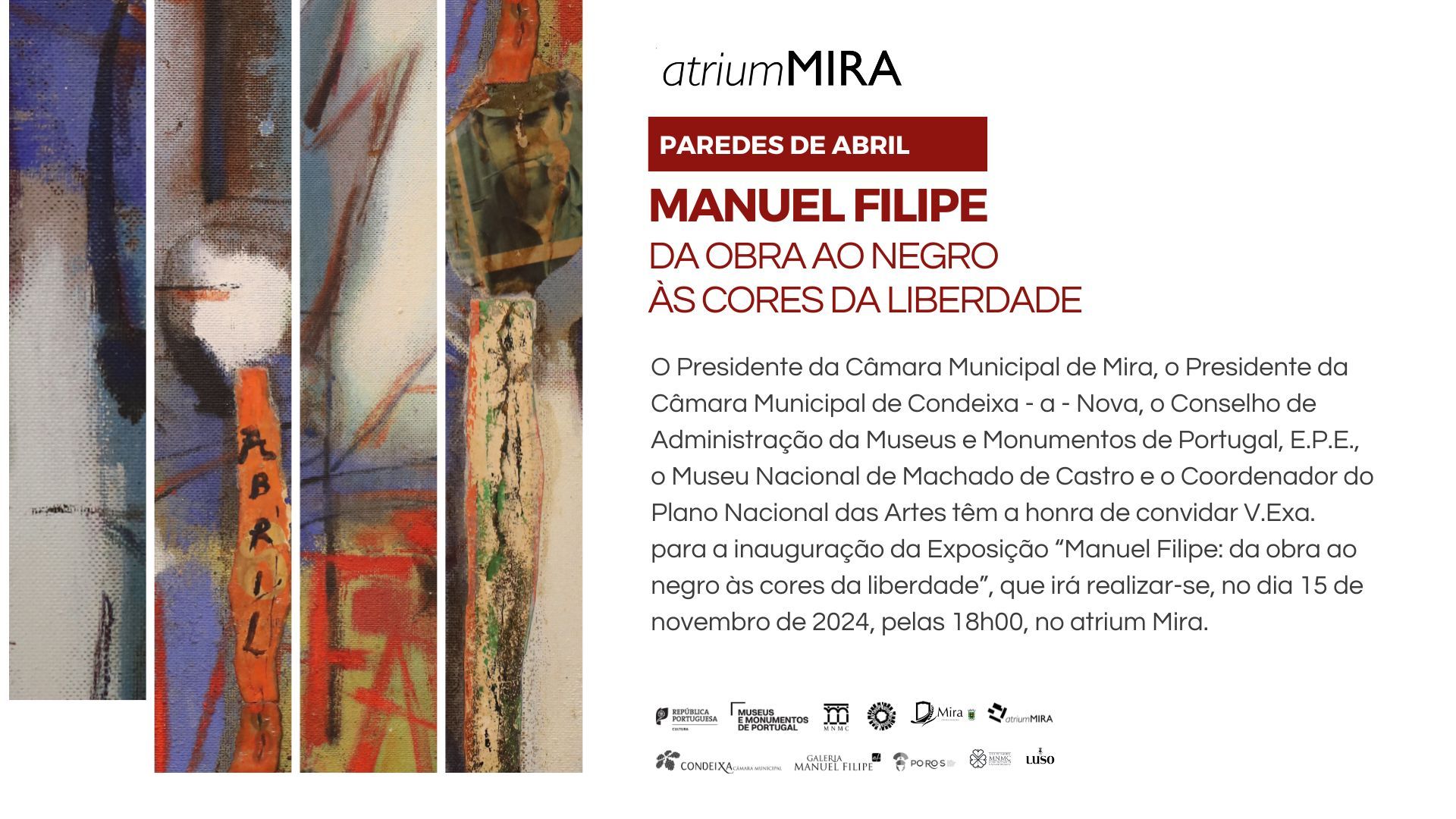 O Município de Mira, em colaboração com o Município de Condeixa, o Museu Nacional de Machado de Castro, a Museus e Monumentos de Portugal, E.P.E., e o Plano Nacional das Artes, têm a honra de convidar todos os interessados para a inauguração da exposição, a realizar-se no 𝗱𝗶𝗮 𝟭𝟱 𝗱𝗲 𝗻𝗼𝘃𝗲𝗺𝗯𝗿𝗼 𝗱𝗲 𝟮𝟬𝟮𝟰, 𝗮̀𝘀 𝟭𝟴𝗵𝟬𝟬, no Atrium Mira.