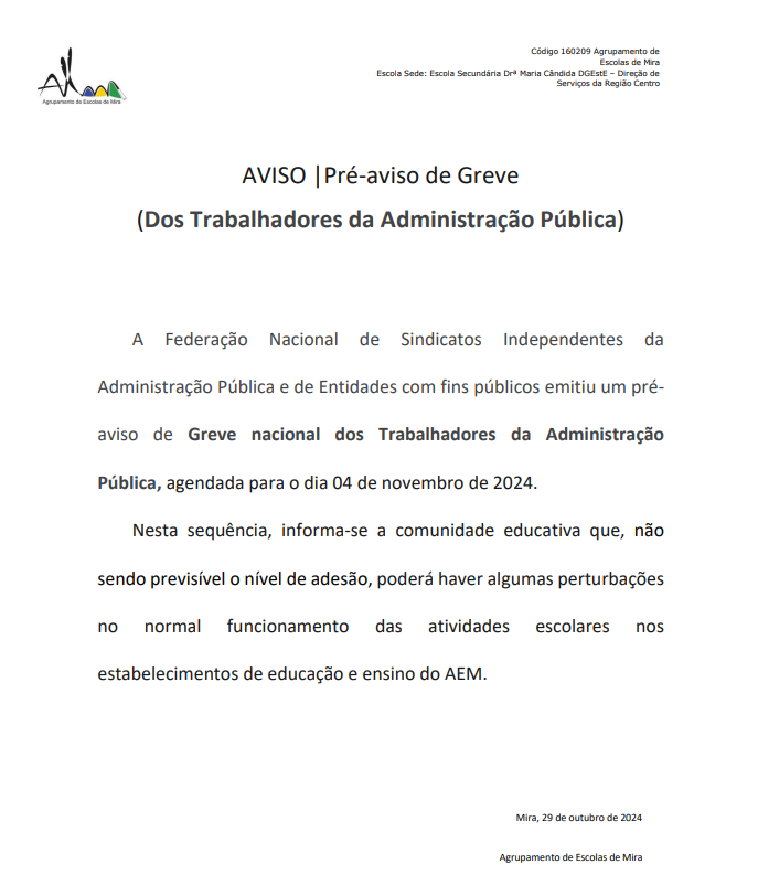 Venho, por este meio, informar que o “Regulamento Interno do Agrupamento de Escolas de Mira 2024-2028” se encontra disponível para consulta na página oficial do Agrupamento (www.escolasdemira.pt). Saliento que o mesmo ainda não se encontra devidamente formatado por estar em fase de conclusão.
