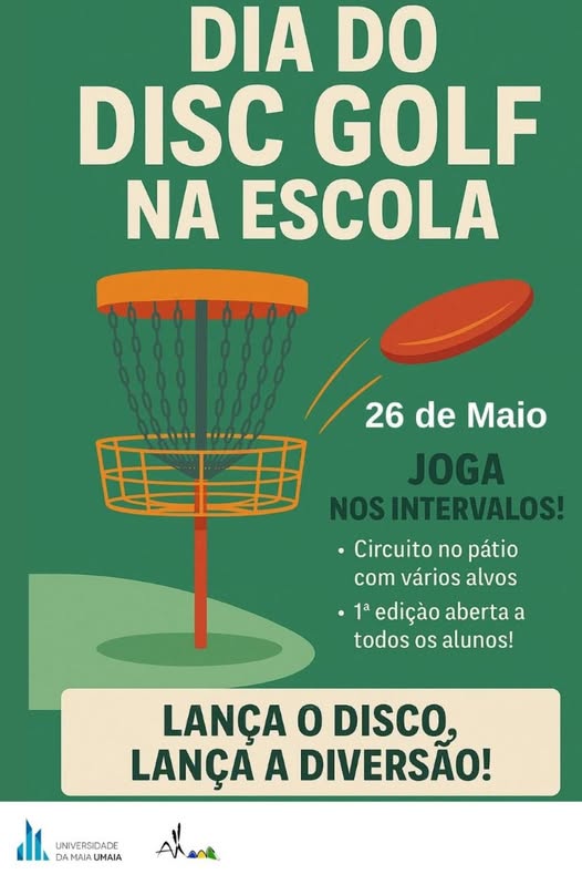 No próximo dia 26 de maio, vem experimentar o Disc Golf na nossa escola!Durante os intervalos, diverte-te com um circuito cheio de desafios no pátio.