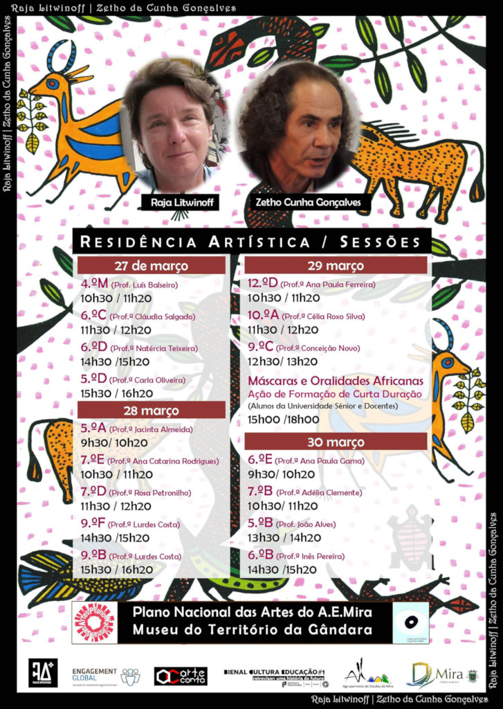 Divulga-se o cronograma das sessões a dinamizar por RAJA LITWINOFF e ZETHO CUNHA GONÇALVES nos dias 27, 28, 29 e 30 de março, no Museu do Território da Gândara.