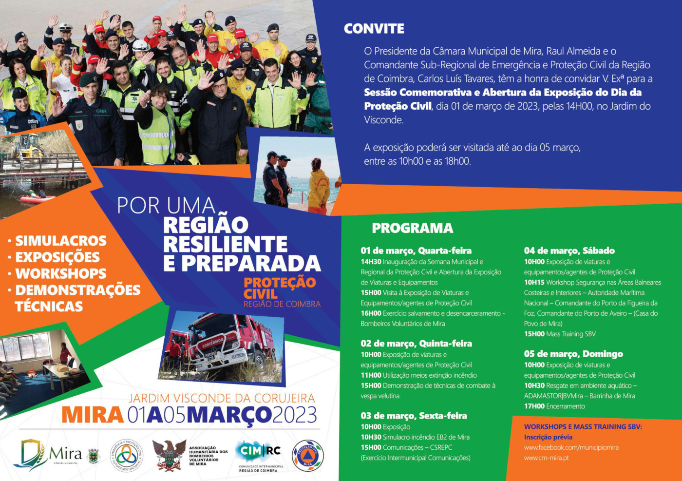 No dia 1 de março de 2023 pelas 14h00, no Jardim do Visconde - Mira, realiza-se uma Sessão Comemorativa e Abertura da Exposição do Dia da Proteção Civil.