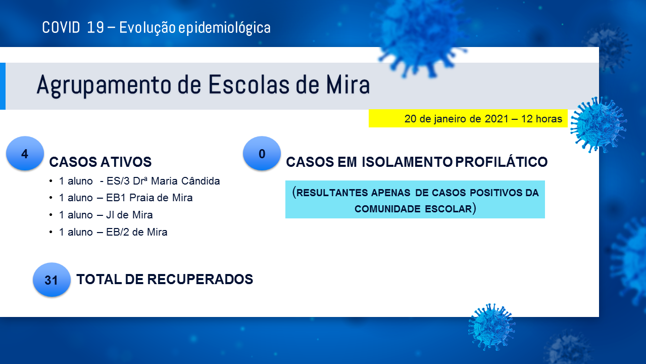 Evolução epidemiológica das Escolas do Agrupamento com base nos dados recolhidos junto da Autoridade de Saúde Local até às 12:00h do dia 20 de janeiro de 2021.