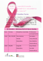 No dia 30 de outubro de 2019 decorrerá uma Palestra, destinada às turmas do 9º ano, sobre Prevenção Primária e Secundária do Cancro, organizada pelas disciplinas de EMRC e Ciências Naturais em colaboração com a Liga Portuguesa Contra o Cancro - Núcleo Regional do Centro.