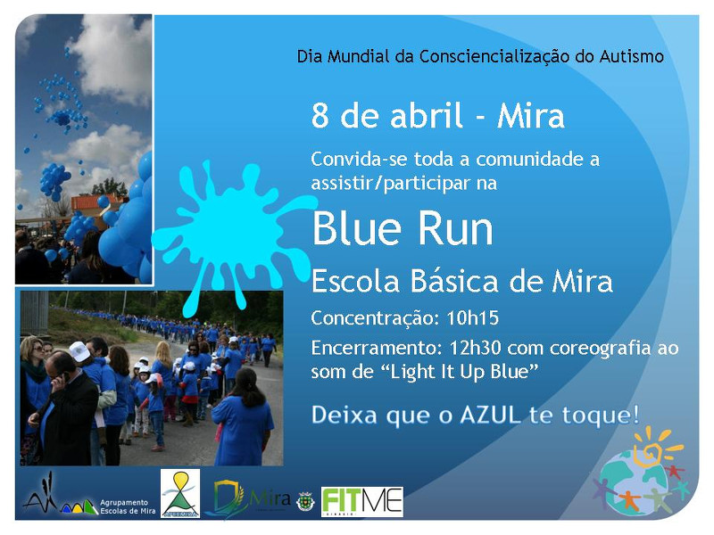 Pede-se a todos os educadores/docentes titulares de turma e diretores de turma que façam uma sensibilização aos alunos no dia 7 de abril. No dia 8 de abril, pelas 10h15 todos os participantes concentrar-se-ão na Escola Básica de Mira e às 10h30m iniciaremos a BLUE RUN pelas ruas de Mira. No final, todas as turmas agrupar-se-ão no campo de jogos da Escola Básica para efetuar uma coreografia ao som da música “Light it up Blue”.