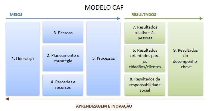 A estrutura da CAF tem 9 critérios que identificam os principais aspectos a ter em conta numa análise organizacional. Cada classificação é composta por um conjunto de subcritérios. Os critérios 1 a 5 dizem respeito aos meios que determinam o que a organização faz e como realizar suas atividades para alcançar os resultados desejados.