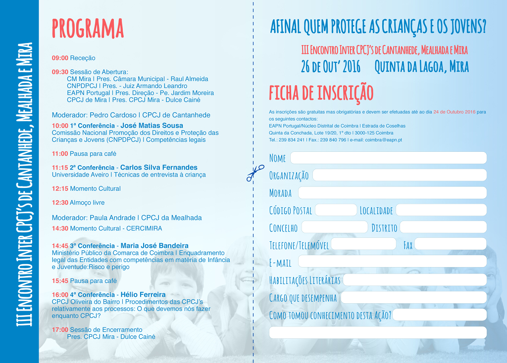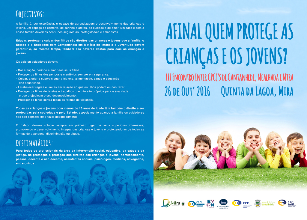 O Núcleo Distrital de Coimbra da EAPN Portugal e o Município de Mira, em parceria com as CPCJ de Cantanhede, Mealhada e Mira, vão organizar o III Encontro Temático Inter-Comissões subordinado ao tema "Afinal quem protege as crianças?”.