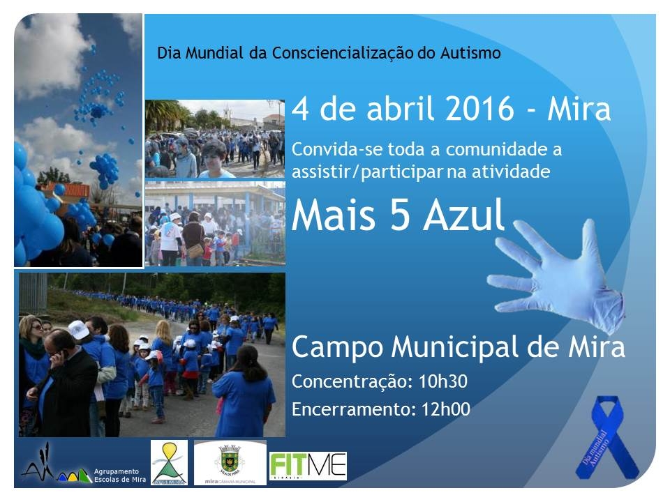 O Agrupamento de Escolas de Mira em parceria com a Associação de Pais de Mira (APEEMIRA), a Autarquia e o Ginásio FITME organizaram a atividade MAIS 5 AZUL para comemorar o Dia Mundial da Consciencialização do Autismo.