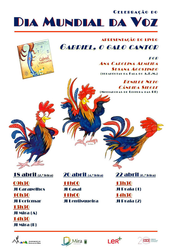 Para evocar o Dia Mundial da Voz, as terapeutas da fala, Ana Carolina Almeida e Susana Agostinho, e as mediadoras de leitura da Biblioteca, Cândida Siegle e Benilde Neto, irão dinamizar uma animação em torno do livro “Gabriel, o galo cantor”, de Isabel Couto e Ricardo Santos, em todos os Jardins de Infância do Agrupamento.