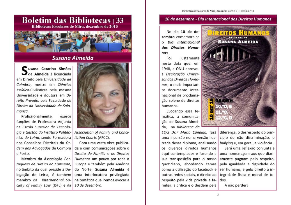 Evocando a data, Susana Almeida estará no próximo dia 10 de dezembro, pelas 15h30, na Biblioteca da ES/3 Dr.ª Maria Cândida, para uma incursão numa versão ilustrada do diploma, analisando os diversos direitos humanos aqui contemplados e fazendo a sua transposição para o nosso quotidiano, abordando temas como a utilização do facebook e outras redes sociais, o direito ao respeito pela vida privada e familiar, a crítica e o desdém pela diferença, o desrespeito do princípio de não discriminação, o bullying e, em geral, a violência.