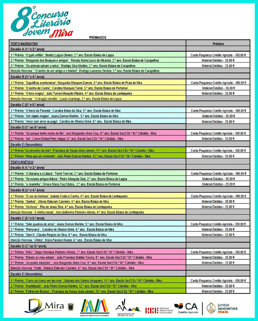 Os prémios, atribuídos por um júri de seis elementos, composto pelo escritor Silvério Manata, um representante da RBE (Rede de Bibliotecas Escolares), a senhora Vereadora da Cultura do Município de Mira e três professores do Agrupamento de Escolas de Mira, serão entregues em cerimónia pública, a realizar no dia 29 de maio, pelas 18h30, na Casa do Povo de Mira.