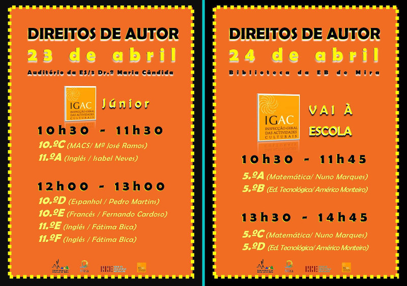 Nos dias 23 e 24 de abril, no âmbito do Dia Mundial do Livro e do Direito de Autor, a Inspeção Geral das Atividades Culturais (IGAC) deslocar-se-á ao nosso Agrupamento para realizar duas palestras com alunos do ensino secundário e duas animações com alunos do 5.ºano, de acordo com os cronogramas que aqui publicamos.