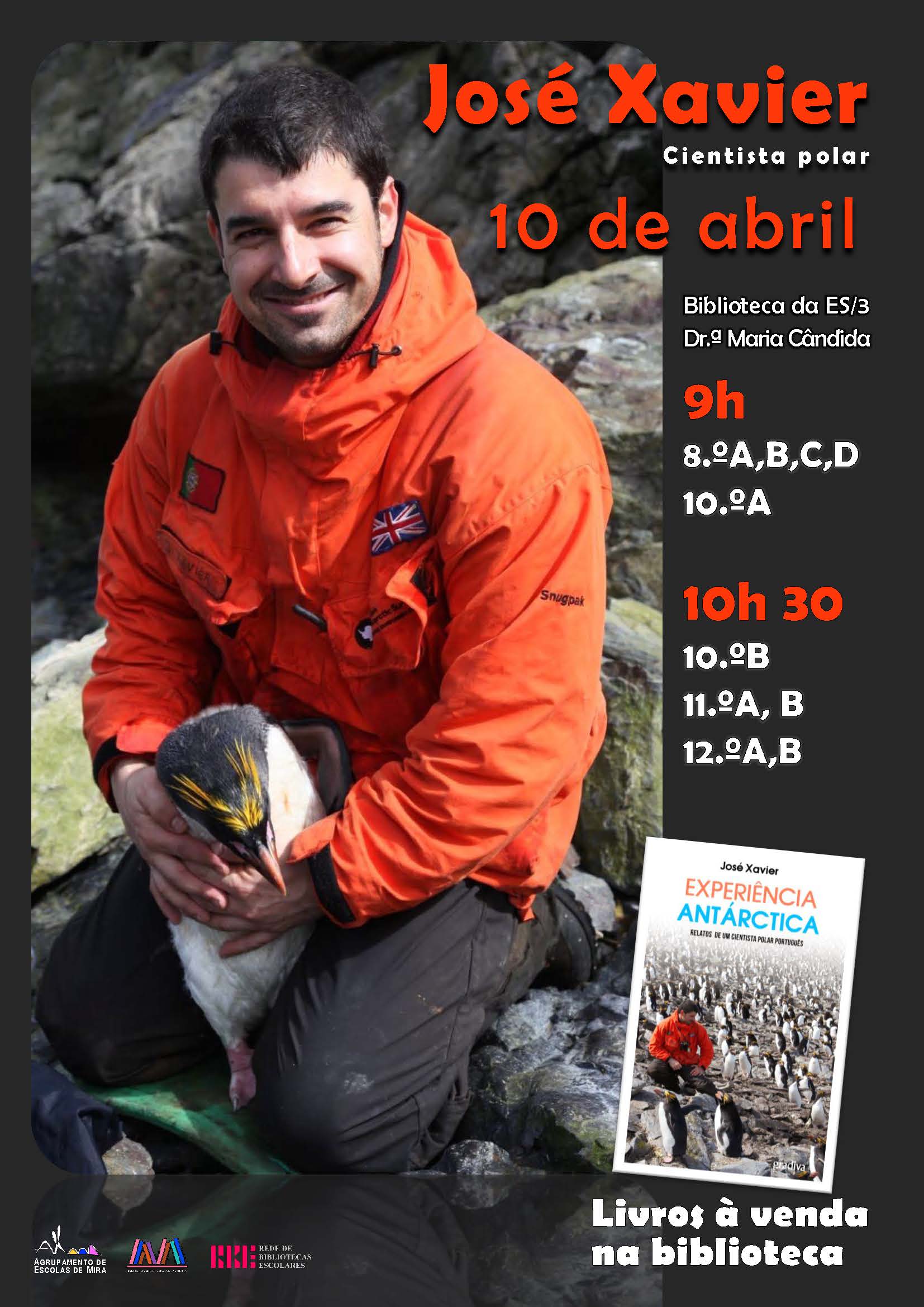 No dia 10 de abril, os alunos do 8.ºano e do ensino secundário do Agrupamento de Escolas de Mira terão um encontro especial com o biólogo marinho José Xavier. Nas duas sessões previstas na Biblioteca da Escola Secundária Dr.ªMaria Cândida, a realizar de acordo com o calendário anexo, os alunos irão interagir com o cientista e com a sua obra, Experiência Antárctica, presentemente à venda na Feira do Livro.