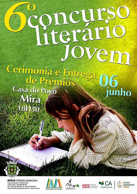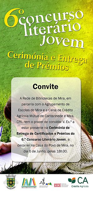 A Rede de Bibliotecas de Mira, em parceria com o Agrupamento de Escolas de Mira e a Caixa de Crédito Agrícula Mútuo de Cantanhede e Mira, CRL, tem o prazer de convidar V. Ex.ª a estar presente na Cerimónia de Entrega de Certificados e Prémios do 6.º Concurso Literário Jovem, a decorrer na Casa do Povo de Mira, no dia 6 de Junho, pelas 18h30.