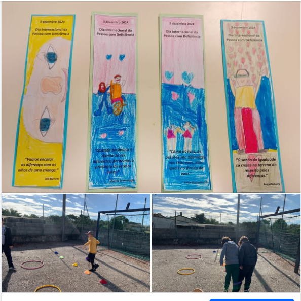 Inicialmente procedeu-se a uma ação de sensibilização do “Dia Internacional da Pessoa com Deficiência”, no sentido de sensibilizar os alunos sobre a diversidade e as necessidades das pessoas com deficiência, promovendo a empatia e o respeito. A atividade foi realizada no exterior da escola, de forma interativa e divertida, com foco na inclusão. Foram criadas quatro estações, - “Desafio visual”; “Ouvidos atentos”; “Caminhando com desafios” e “Pensando diferente”. Os alunos foram divididos em grupos e fornecido a cada grupo um conjunto de materiais. Cada grupo “vivenciou” um tipo de deficiência, passando por estações diferentes de jogos que simulam as dificuldades que uma pessoa pode enfrentar no dia a dia. Em simultâneo, foram abordados conteúdos como orientação espacial, percursos, órgãos dos sentidos e interpretação de plantas, em articulação com as diferentes disciplinas. Seguidamente, os alunos decoraram um marcador de livros com frases sobre a diferença e a inclusão. Todos os objetivos previamente estabelecidos para esta Atividade foram alcançados e superaram claramente as expetativas, dada a envolvência e o entusiasmo que permitiu entre alunos e professores.