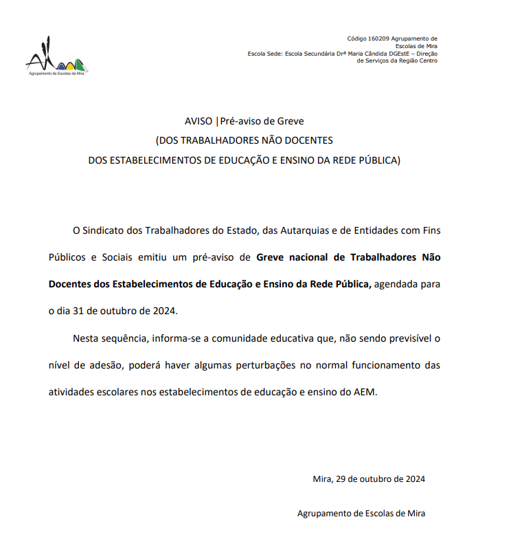 Venho, por este meio, informar que o “Regulamento Interno do Agrupamento de Escolas de Mira 2024-2028” se encontra disponível para consulta na página oficial do Agrupamento (www.escolasdemira.pt). Saliento que o mesmo ainda não se encontra devidamente formatado por estar em fase de conclusão.