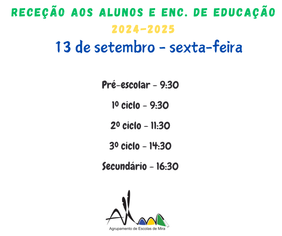 A direção do Agrupamento de Escolas de Mira informa toda a comunidade escolar que, no próximo dia 13 de setembro de 2024, sexta-feira, decorrerá a receção aos alunos e Encarregados de Educação, de acordo com os horários ao lado indicados: