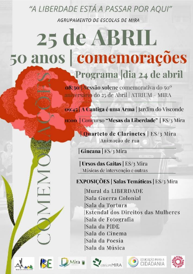 A evocação dos 50 anos do 25 de Abril, marco histórico da nossa Democracia, decorre no Agrupamento de Escolas de Mira, de acordo com um vasto e ambicioso programa que se tem vindo a concretizar desde início do ano letivo de 2023 e que culminará no dia 24 de Abril com um dia de atividades exclusivamente dedicadas aos 50 anos | 25 Abril, conforme programa.