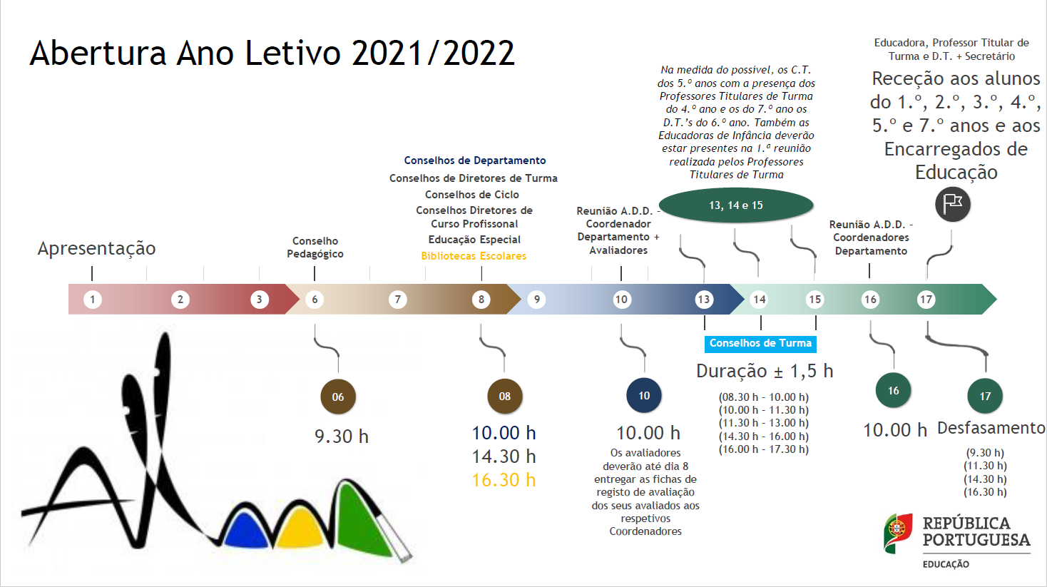 - às 08h30 com o(a) respectivo(a) Diretor(a) de Turma (2º e 3º CEB e Ensino Secundário e Profissional). A partir das 09h30 as atividades letivas decorrerão de acordo com o respectivo horário da turma.