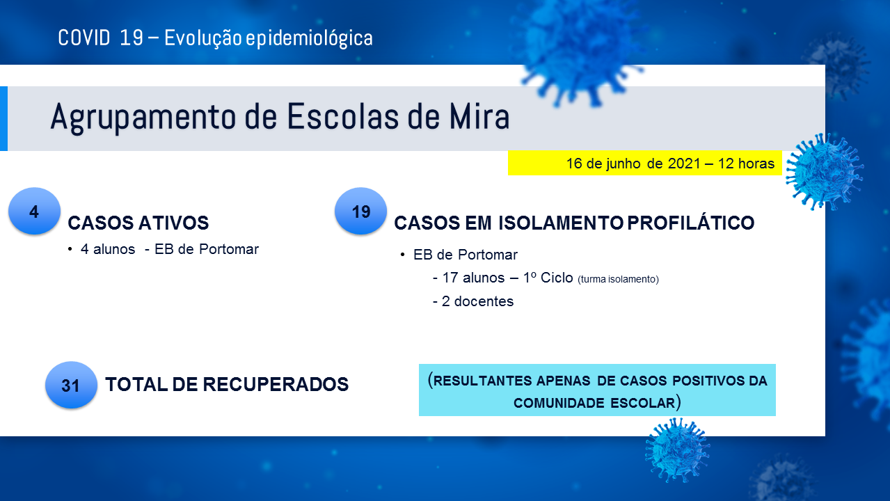 Evolução epidemiológica das Escolas do Agrupamento com base nos dados recolhidos junto da Autoridade de Saúde Local até às 12:00h do dia 16 de junho de 2021.