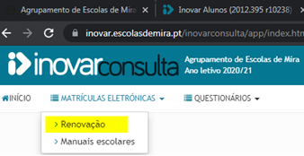 1. Considerando ainda a necessidade de proceder à atualização de dados, assim como à recolha de informação prévia sobre a opção de frequência na disciplina de EMR e de diversas autorizações (saídas e divulgação de imagens), solicita-se aos Encarregados de Educação que acedam ao portal “Inovar Consulta Alunos” – menu “MATRÍCULAS ELETRÓNICAS- Renovação”, a fim de proceder ao acima referido, de acordo com as seguintes datas: