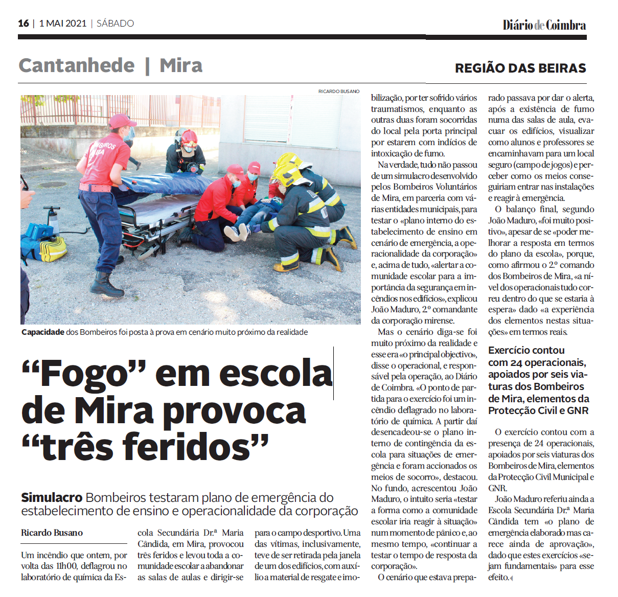 Referência no Diário de Coimbra ao exercício de simulacro na Escola Secundária Drª Maria Cândida para testar o plano de emergência do estabelecimento de ensino e operacionalidade dos agentes locais da protecção civil.