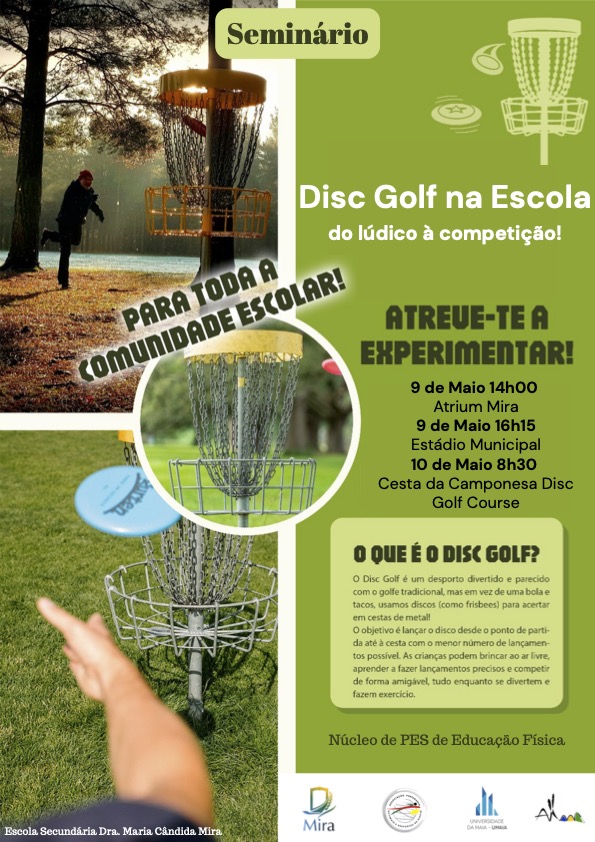 O Agrupamento de Escolas de Mira, através do Núcleo de PES de Educação Física, convida toda a comunidade educativa a participar no Seminário "Disc Golf na Escola: do lúdico à competição".Esta iniciativa pretende dar a conhecer e promover a prática do Disc Golf, um desporto divertido e acessível a todas as idades, que alia a atividade física ao convívio ao ar livre, em ambiente de amizade e aprendizagem.