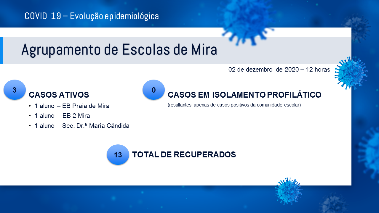 Evolução epidemiológica das Escolas do Agrupamento com base nos dados recolhidos junto da Autoridade de Saúde Local até às 12:00h do dia 02 de dezembro de 2020.