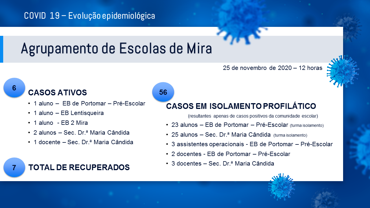 Evolução epidemiológica das Escolas do Agrupamento com base nos dados recolhidos junto da Autoridade de Saúde Local até às 12:00h do dia 25 de novembro de 2020.