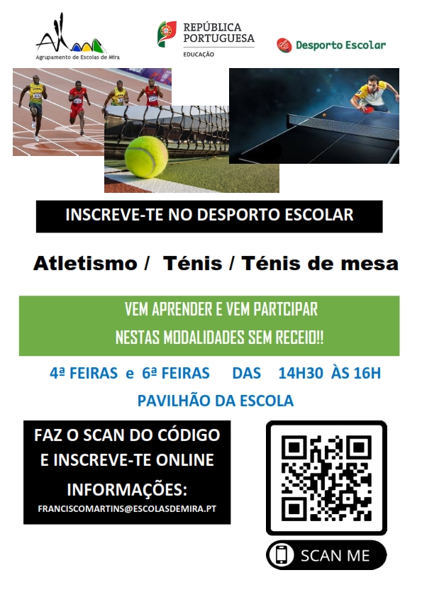 Estão abertas as inscrições para o Desporto Escolar, nas modalidades de Atletismo, Ténis e Ténis de Mesa.