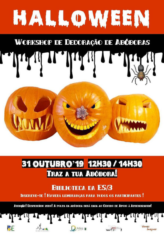 No dia 31 de outubro, das 12h30 às 14h30, as professoras Guida Alegrio, Zélia Mouro e Rosário Figueiredo dinamizarão um workshop de decoração de abóboras de Halloween na Biblioteca da ES/3 Dr.ª Maria Cândida.