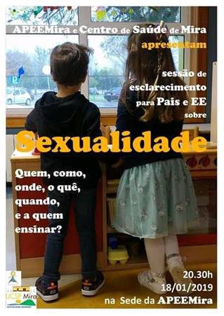 A APEEMIRA e o Centro de Saúde de Mira, irão apresentar uma sessão de esclarecimento para pais e encarregados de educação, com o tema 'Sexualidade. Quem, como, onde, o quê, quando e a quem ensinar?' cuja oradora será a Sra enfermeira Paula Cristina Castelhano.